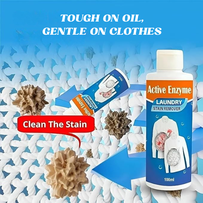 Our Active Enzyme Laundry Stain Remover is powered by advanced enzyme technology that breaks down and lifts stubborn stains — from oil and grease to coffee, ink, and sweat — leaving your fabrics fresh, clean, and vibrant